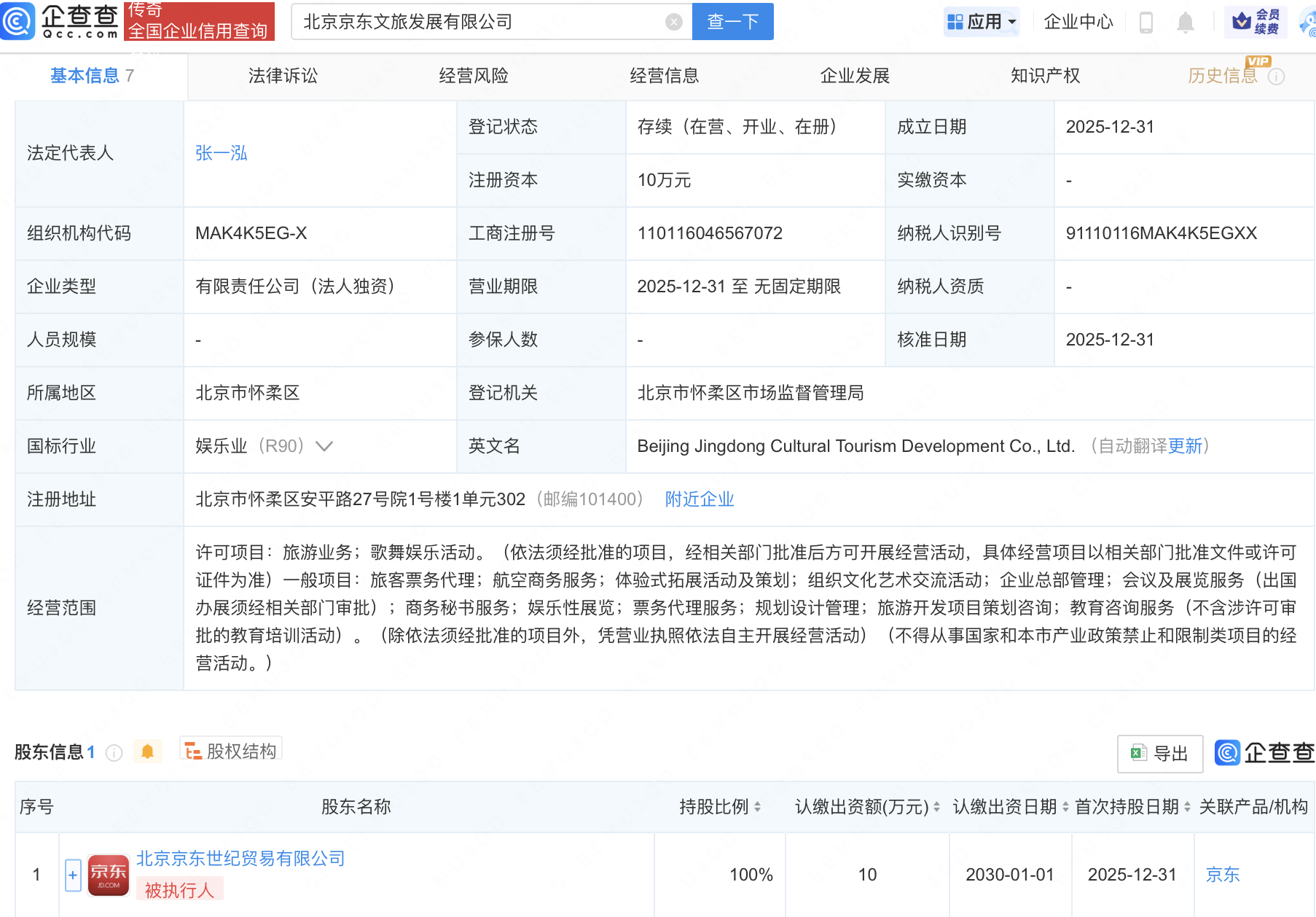近日,北京京东文旅发展有限公司成立,经营范围包含:旅游业务;歌舞娱乐活动;航空商务服务;体验式拓展活动及策划;组织文化艺术交流活动等。企查查股权穿透显示,该公司由北京京东世纪贸易有限公司全资持股。